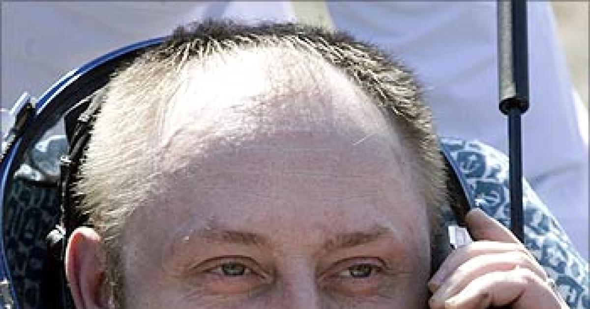 Image: US astronaut Michael Fincke speaks on a satellite phone after returning from the International Space Station.