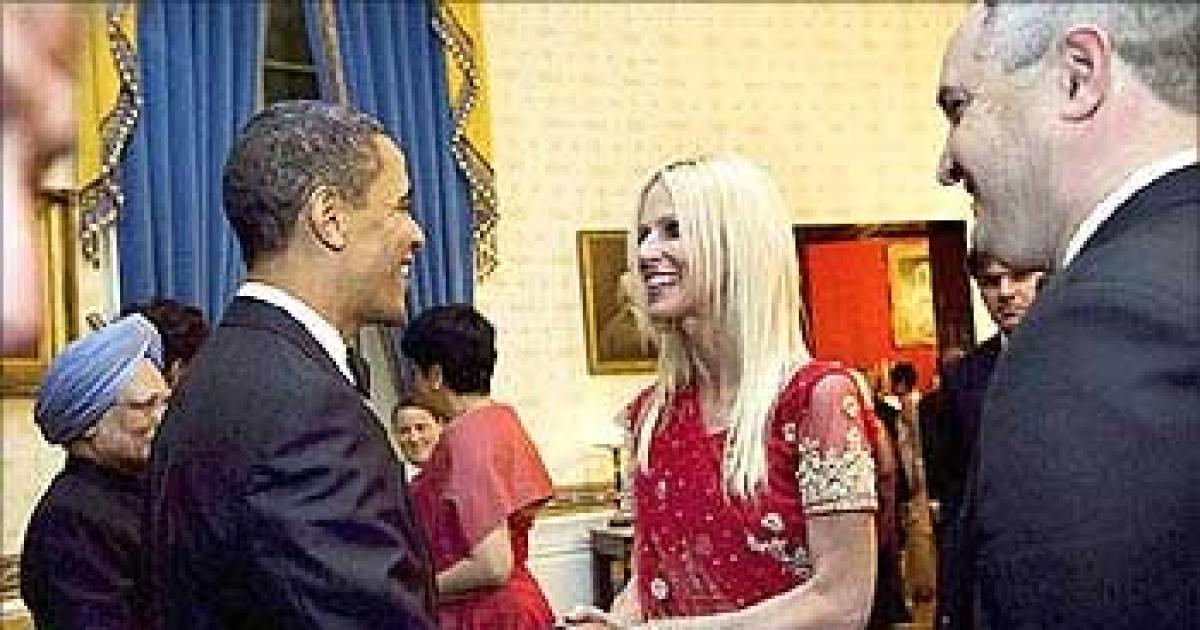 Image: US President Barack Obama greets Michaele Salahi and her husband Tareq during a state dinner.