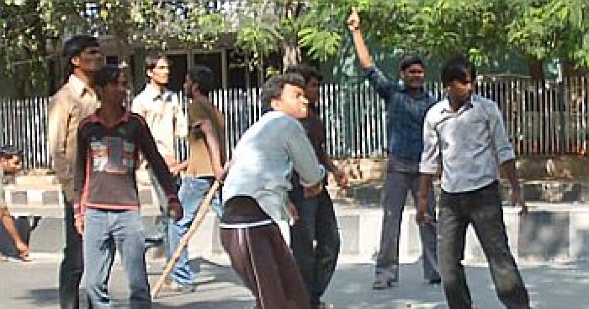 Image: Pro-Telangana activists pelt stones towards police barricades at Nizam College in Hyderabad on Thursday