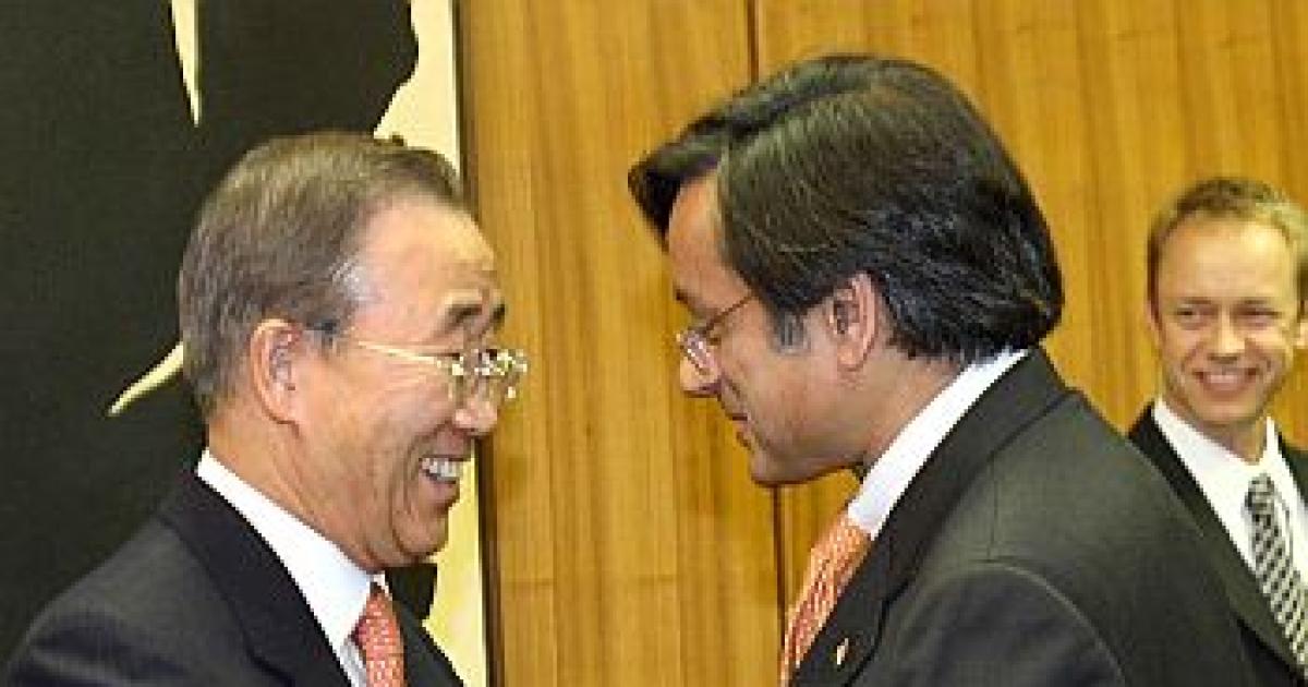 Image: United Nations Secretary-General Ban Ki Moon greets Minister of State for External Affairs Shashi Tharoor at the United Nations headquarters in New York.