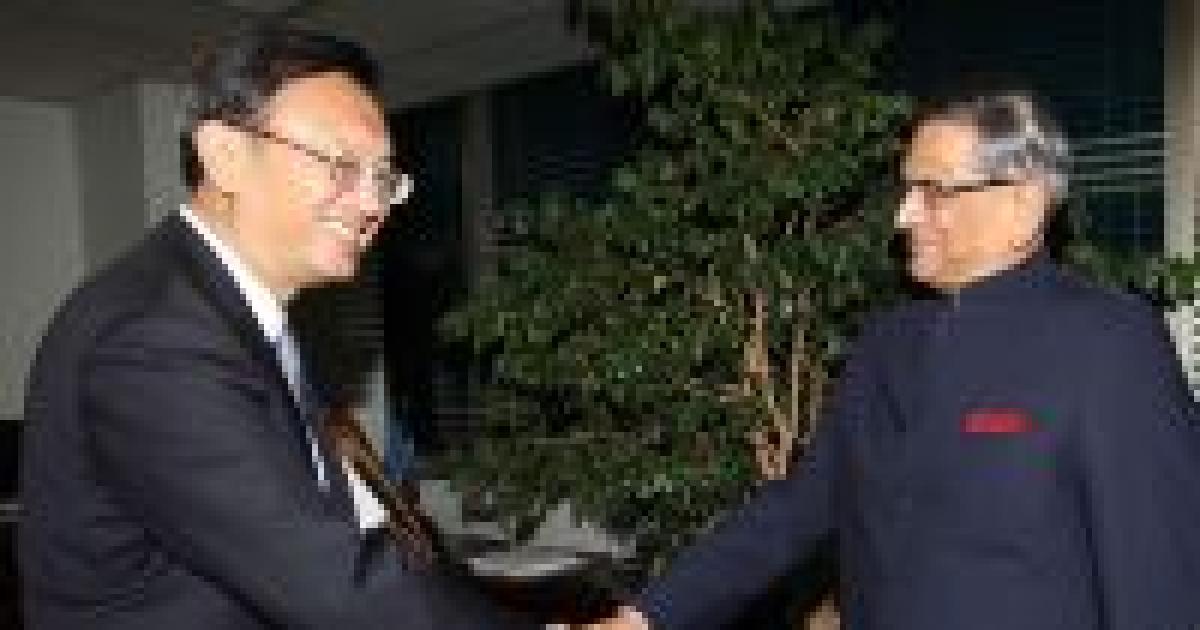 Image: External Affairs Minister S M Krishna (right) greets his Chinese counterpart Yang Jiechi at the G5 meeting in New York | Photograph: Jay Mandal