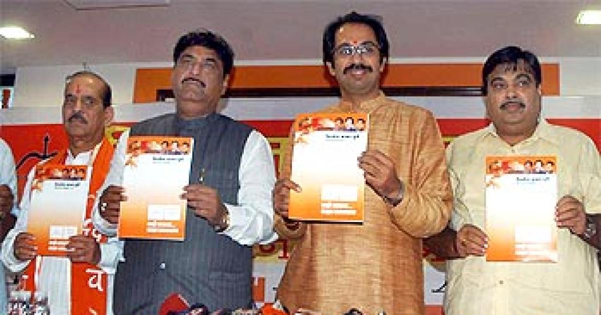 Image: Shiv Sena Executive President Uddhav Thackeray, senior BJP leaders Nitin Gadkari and Gopinath Munde, and former Maharashtra CM Manohar Joshi release their election manifesto for the Maharashtra assembly polls on October 13, in Mumbai on Monday.