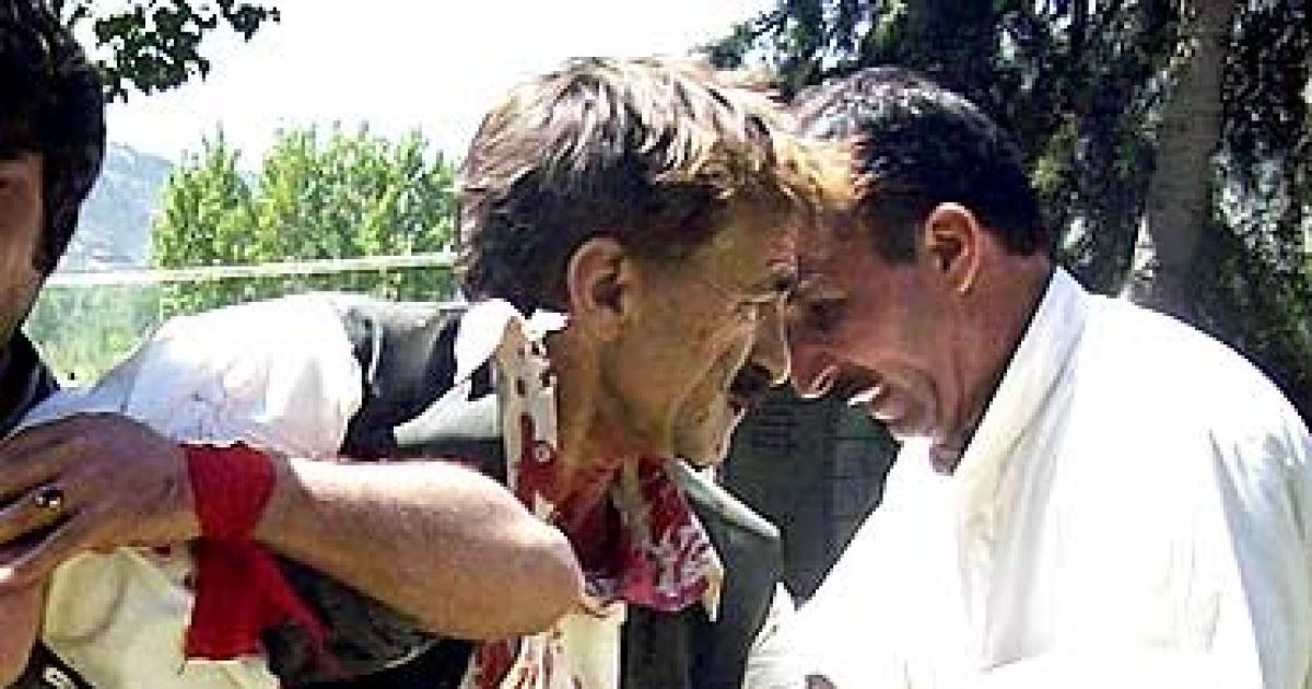 Image: An injured man is assisted at the site of a suicide bomb attack in Timergarah, situated in Lower Dir district of Pakistan's restive North West Frontier Province on Monday.