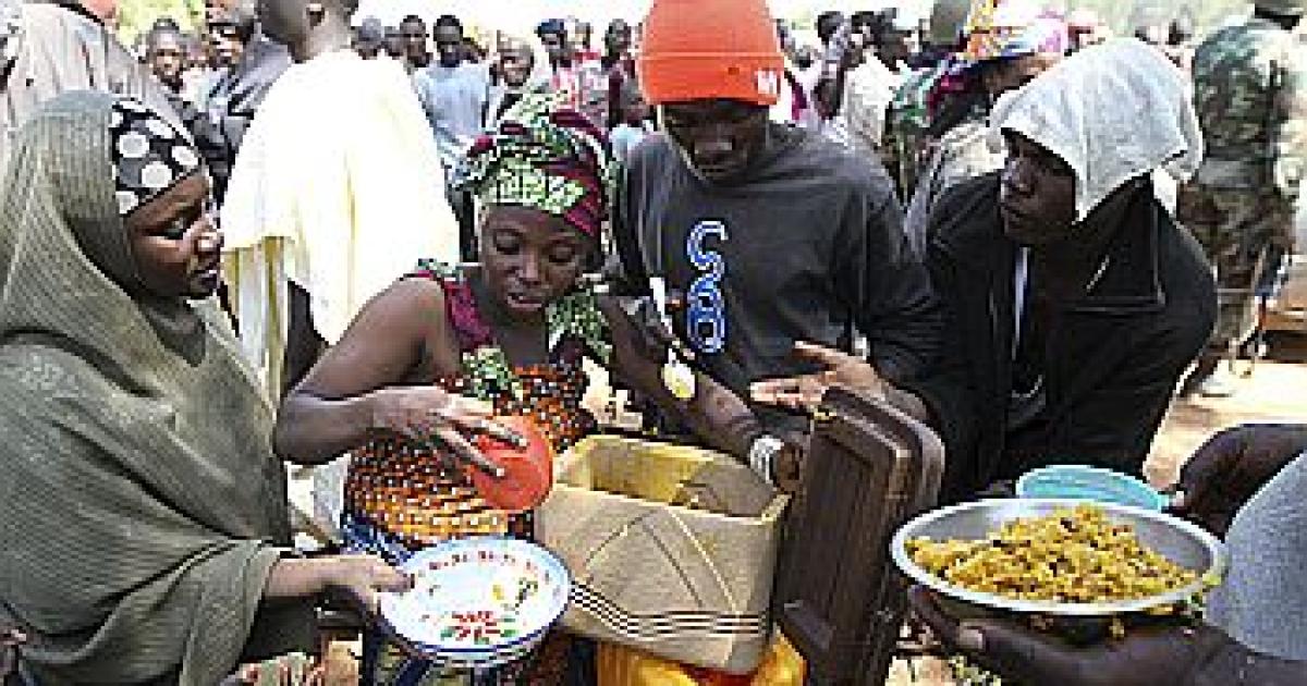 Image: A woman shares food with people at an internally displaced persons camp in Nigeria's central city of Jos on Wednesday