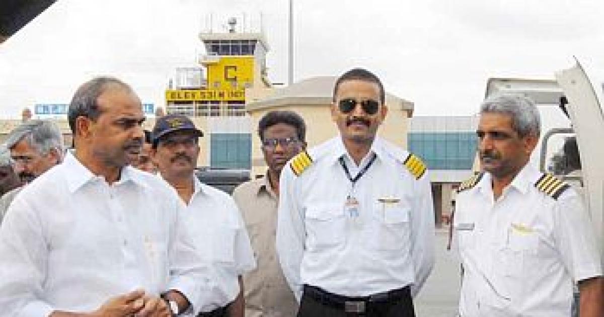 In the photograph above, Reddy is seen with his helicopter's pilots -- Group Captain S K Bhatia (Right) and Captain M S Reddy (Centre). Also visible in extreme left, behind the chief minister, is Principal Secretary P Subramanyam.