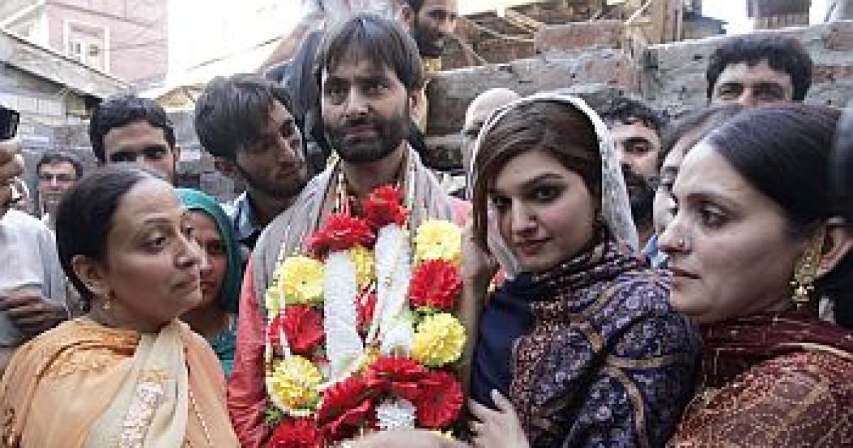 Jammu and Kashmir Liberation Front Chairman Mohammad Yasin Malik and his Pakistani bride Mishal Mullick arrived in Srinagar on Sunday to an affectionate welcome both at the airport and at his uptown Maisuma locality in capital Srinagar.