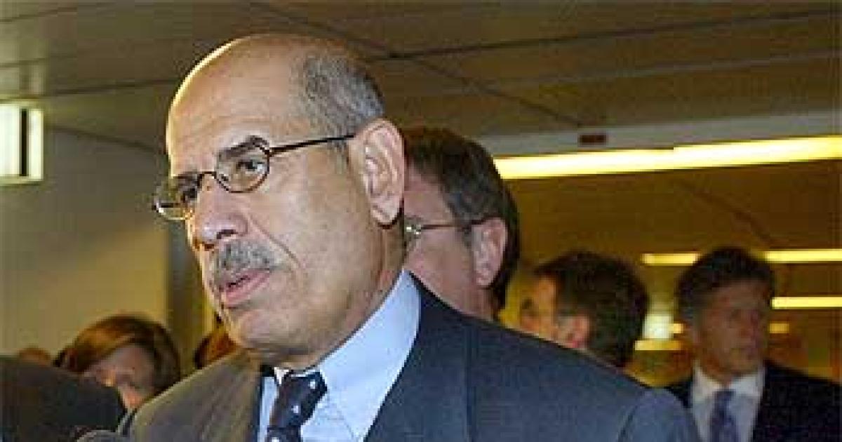 Image: International Atomic Energy Agency director general Mohammed El Baradei talks to journalists in Vienna.
