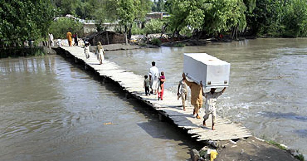 Image: Flood victims carry their belongings while walking through a makeshift bridge in a village in Charsada in Pakistan's northwest Khyber-Pakhtunkhwa Province | Photograph: Reuters