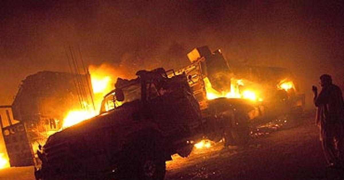 Ten to 12 attackers opened fire at the vehicles and then set them ablaze. At least 50 tankers and trucks, including several loaded with military vehicles, were reduced to a twisted mass of metal by a massive fire and several explosions.