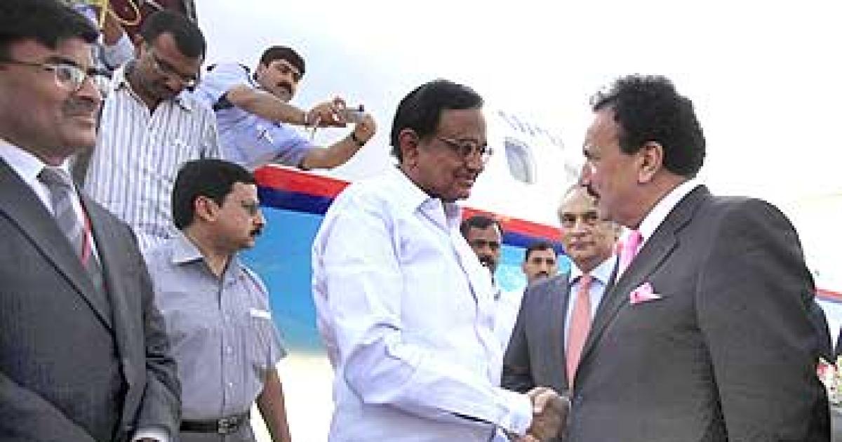 Image: Pakistan's Interior Minister Rehman Malik greets P Chidambaram after his arrival | Photograph: Faisal Mahmood/Reuters